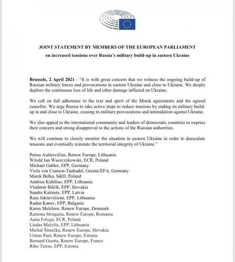 – Zajedno sa mojim kolegama u Evropskom parlamentu apelovala sam na međunarodnu zajednicu da oštro osudi vojne akcije koje dolaze sa ruske strane već neko vreme. Raspoređivanje 28 bataljona u blizini ukrajinske istočne granice znači stvarnu pretnju za Ukrajinu – napisala je vod Kramon na Tviteru, objavivši fotografije dokumenta na kojima se nalaze i imena potpisnika apela.