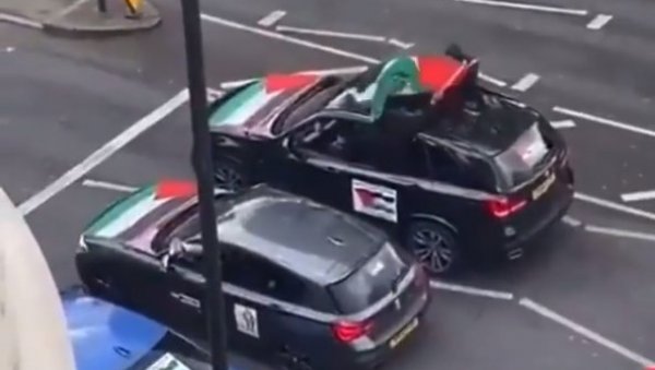 Video snimak prikazuje nekoliko automobila na kojima su okačene palestinske zastave kako prolaze severnim Londonom, gde živi veliki broj pripadnika jevrejske zajednice, preneo je AP.
