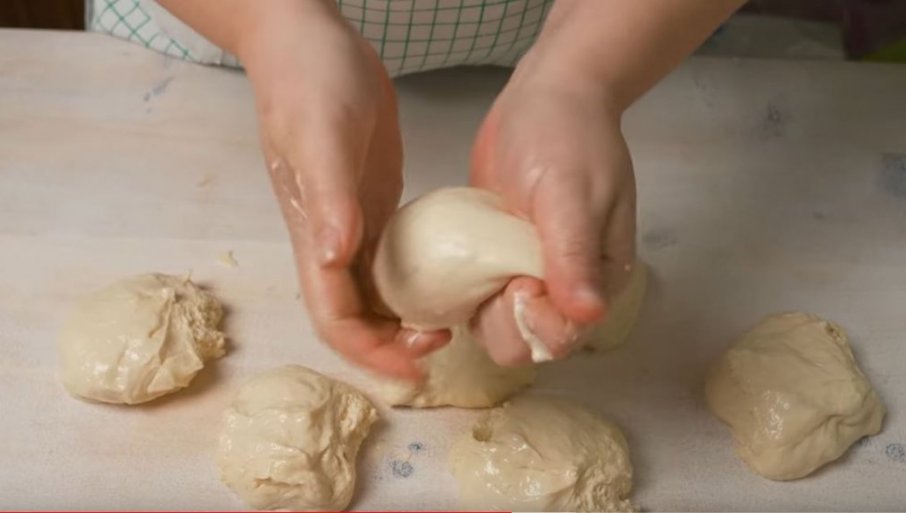 Brašno i so i izmešati u vangli i u sredini napraviti udubljenje, pa tu sipati nadošli kvasac i umesiti glatko, mekano testo. Testo se mesi 10 minuta, dok testo ne počne da se odvaja od dna posude. Za to vreme postaće veoma lepljivo, ali neka vas to ne brine, tako treba da bude.