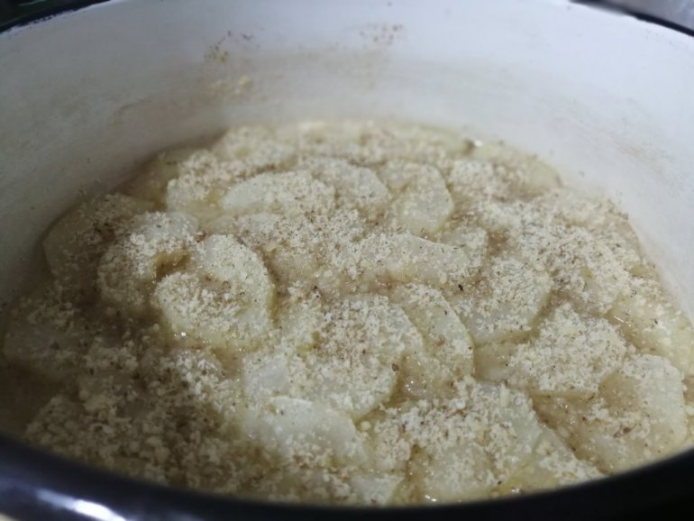 Dno dubljeg tiganja ili šerpe se prekrije šećerom debljine jedan santimetar. Očiste se jabuke na kriške i ređaju u krug da pokriju celo dno. Jabuke se pospu sa malo mlevenih oraha. Szavi se u zagrejanu rernu da se kratko peče.