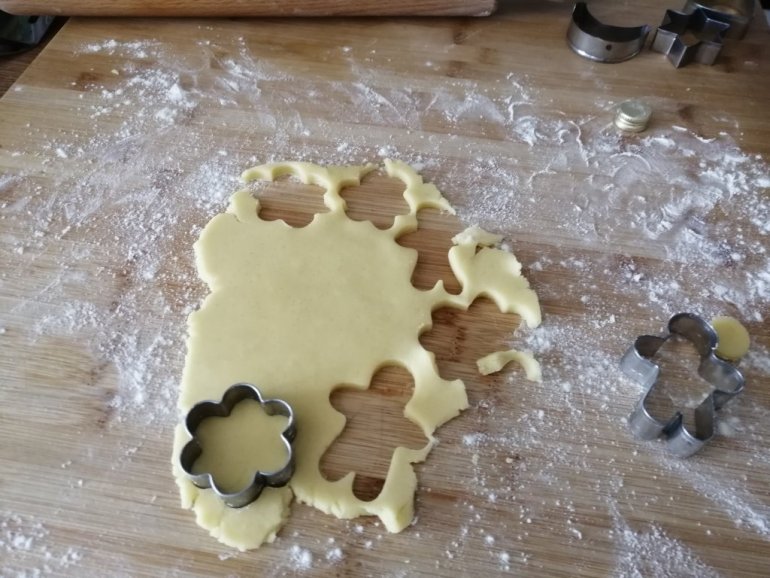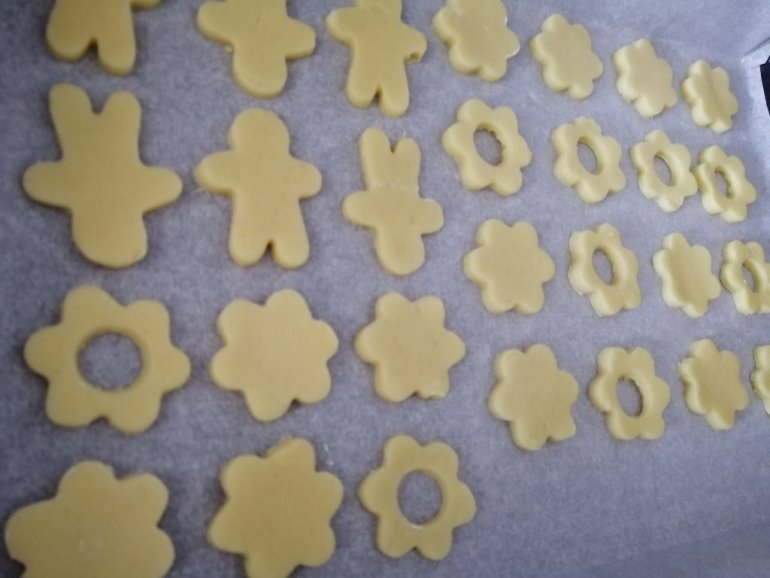 Testo se pažljivo razvije što tanje, a u pleh se stavi papir za pečenje i uključi rerna. Na testu se modlicama sa figuricama vade kolačići i ređaju u pleh. Između kolačića mora da postoji razmak jer će zbog praška za pecivo malo porasti. Ko želi da pravi duple kolačiće sa pekmezom, jedan kolačić treba da ima rupicu u sredini.