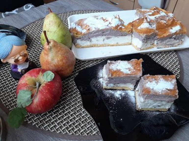Dodajemo 1 po jedno jaje i mešamo varjačom ili mikserom da se izjednači i masa bude lepo glatka. Pleh 30x20 obložimo pek papirom i sipamo pola mase i raspodelimo po dnu pleha.