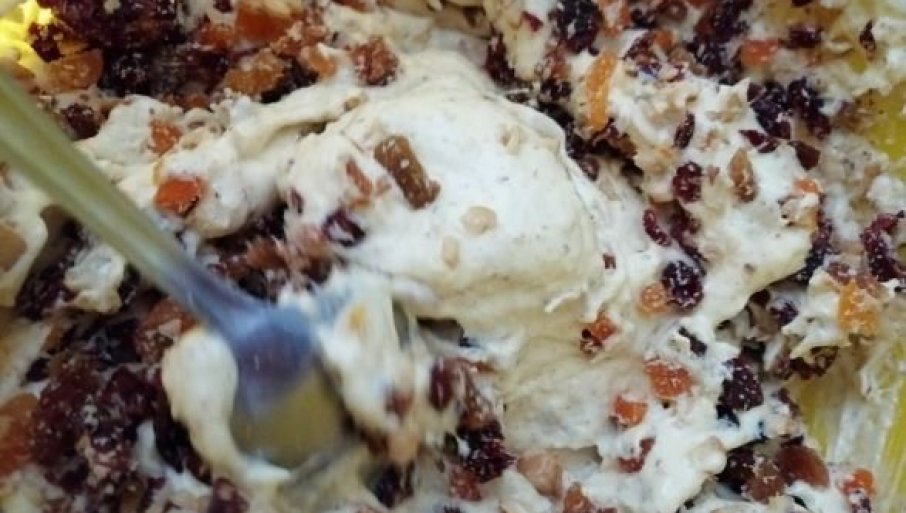 Prvo se na sitne kockice isecka suvo voće. Kruška se oljušti i isecka na kockice. Orasi se iseckaju grublje, na veličinu kruške i suvog voća. Kruška će kolaču doneti sočnost, a orasi ukus.