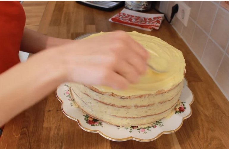 Umiksajte omekšali puter i vanilin šećer, pa postepeno dodajte smesu sa kukuruznim skrobom, muteći čitavo vreme. Dodajte u smesu seckane orahe, ali odvojite manji deo za dekoraciju. Nanesite polovinu fila preko prve kore za žito tortu, prekrijte drugom korom pa rasporedite ostatak fila.
