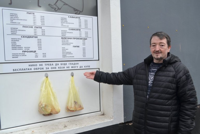 On svakog dana u svojoj radnji "Pite ispod sača 0230", naravno za prodaju pita ispod sača, koju je nedavno otvorio u Kikindi, obezbeđuje besplatan obrok za one koji ne mogu da kupe ručak za sebe ili svoju porodicu.