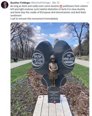 "Dokle god Srbi, pa čak i neki austrijski političari ekstremne levice i desnice podržavaju takvo mrsko izvrtanje činjenica, jasno je da Austrija i Srbi ostaju kolevka evropskog antiamerikanizma i antinatovskog raspoloženja. Pozivam da se ovaj spomenik odmah ukloni".