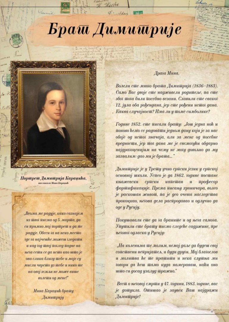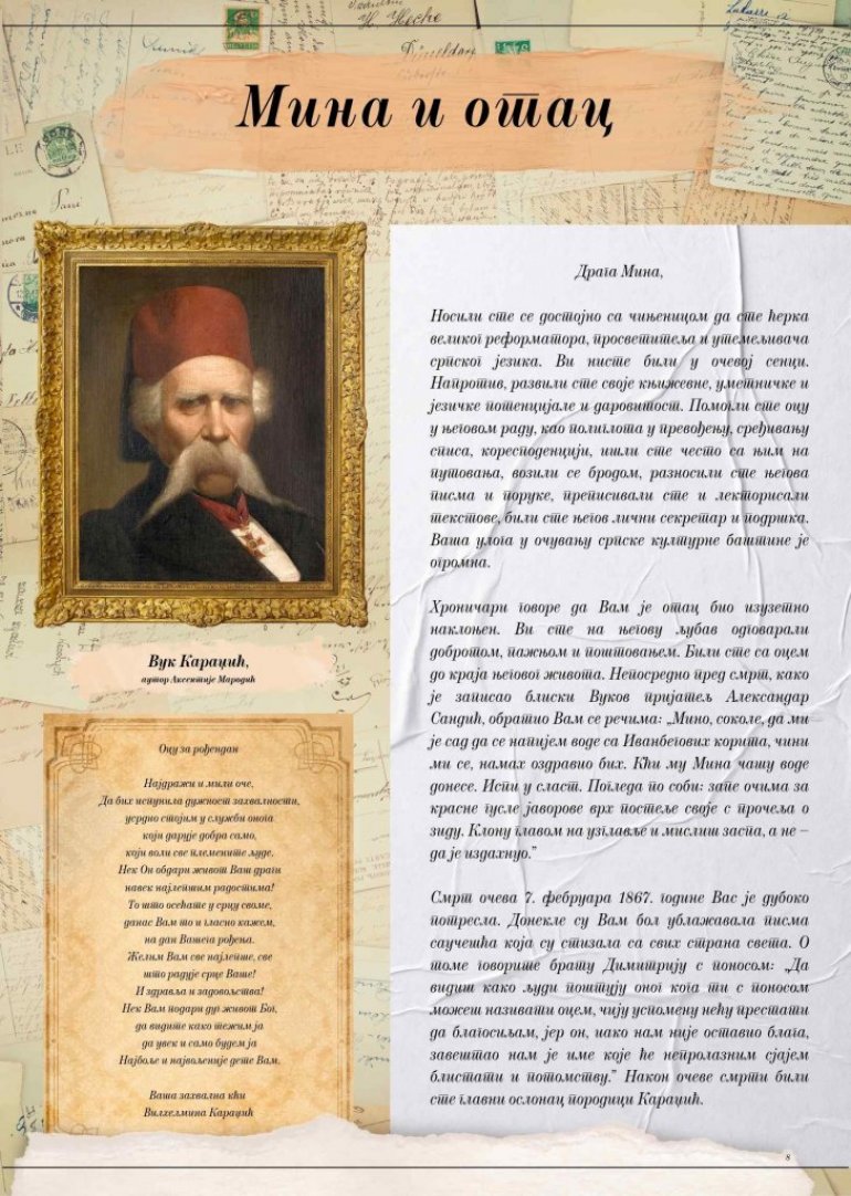 - Mina je imala briljantan um, pronicljive poglede, privlačila je pažnju - kaže autorka izložbe. - Cenili su je svi Vukovi prijatelji, među njima i Njegoš. Volela je operu, rado odlazila u pozorište, najčešće u pratnji Ludviga Augusta Frankla. Često je svirala klavir, uvek kad su im u poseti bili Branko Radičević i Đuro Daničić. Jernej Kopitar joj je bio posebno naklonjen. S 15 godina je počela da uči očev jezik, da bi osim nemačkog, francuskog, engleskog, ruskog, znala i srpski!