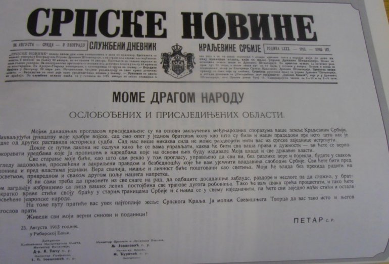 - Narod čija je vojska za nekoliko nedelja stigla sa Javora, Merdara i Ristovca do Jadrana, Soluna i Marice moći će i na polju mirnoga rada ubrzo pokazati da je dorastao svojim velikim kulturnim zadacima - zapisao je kralj Petar Prvi. - On će svojim radom i životom posvedočiti da je dostojan visine na koju ga je ratna sreća iznela. Ja se sada više nego ikad ponosim što sam i sin i kralj takome narodu, i molim Svemogućega da mu nikad ne uskrati svoju milost i zaštitu.