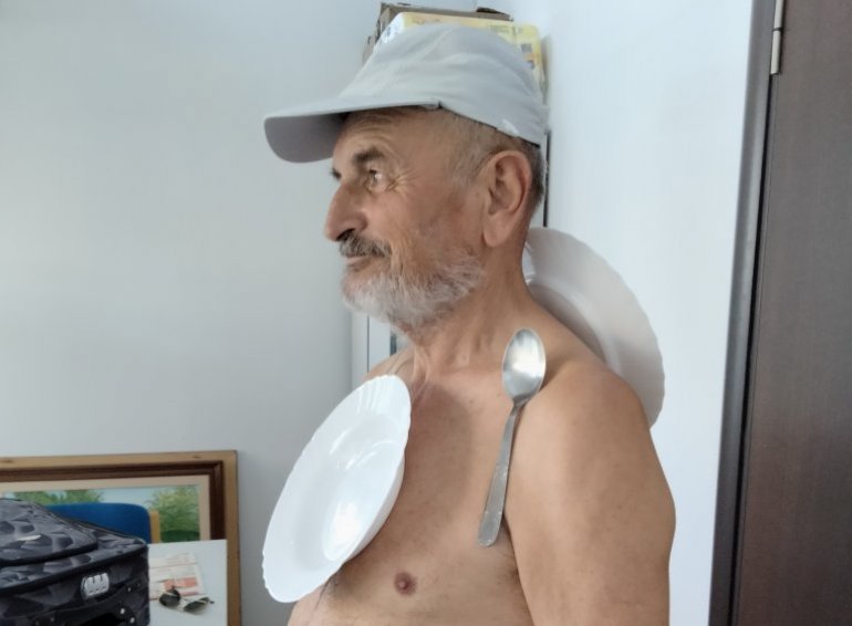 Bez problema i straha da će pasti i razbiti se, ovaj penzioner iz Sivca, poznat pod nadimkom Kramer, na grudi, ali i na leđa, kao na stolu, postavi velike tanjire od arkopala i escajg. Šaljivo dodaje, da je jedini problem, što u njih ne može da se sipa hrana.