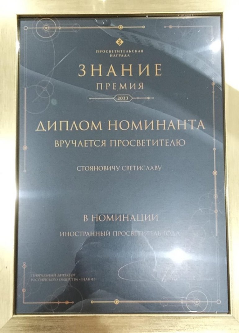Za mogućnost da dobiju ovo prestižno priznanje, koje je 2021. ustanovila Državna obrazovna organizacija Rusko društvo "Znanje", izabrano je čak 165 stranaca koji rade u školama i na fakultetima širom najveće zemlje sveta, a među petoro finalista bio je Svetislav Sveta Stojanović (69), penzionisani profesor matematike iz Vršca, od jesenas predavač u Lugansku, koji RF smatra svojom teritorijom.