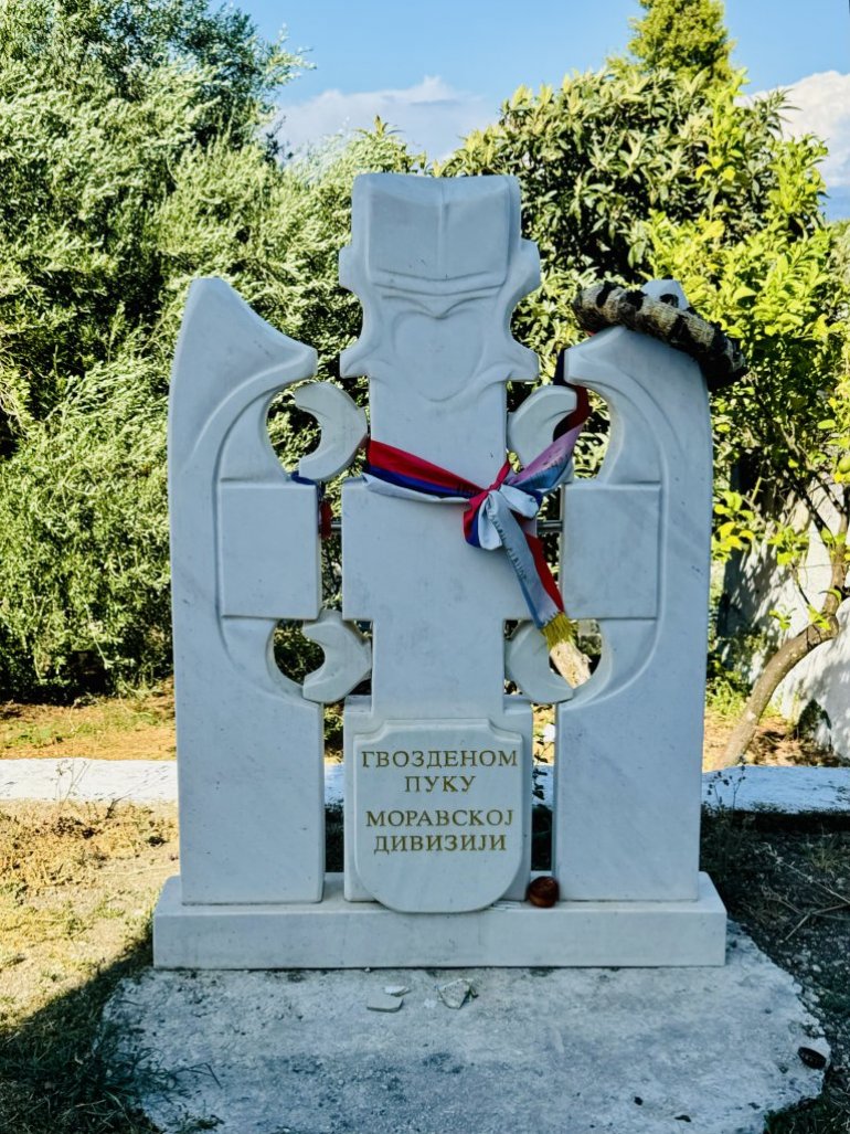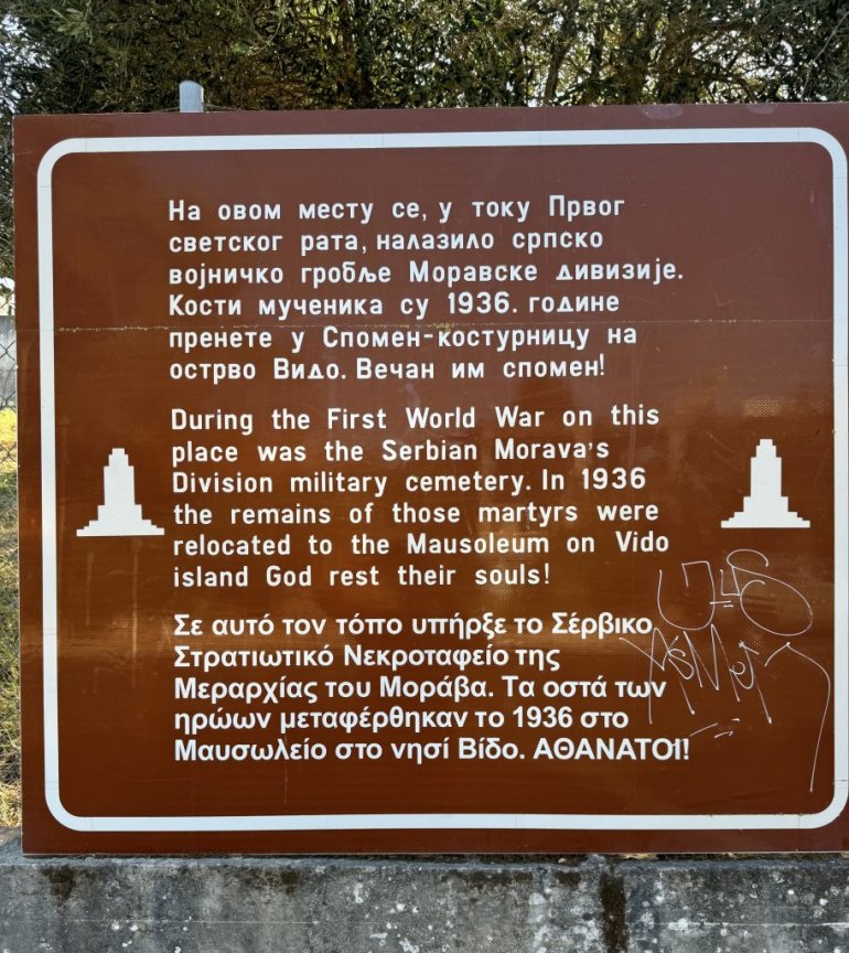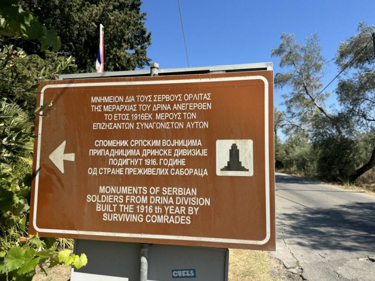 Tridesetak kilometara južnije, u mestu Agios Mateos, nalazi se spomenik Drinskoj diviziji. Podigli su ga saborci 1916. godine i to je jedno od prvih obeležja iz Prvog svetskog rata. Na spomeniku srpska zastava. Potpisali se potomci Milan i Gordana Bobić, uz poruku da junaci nisu zaboravljeni. Sveća, ikona, brojanica.