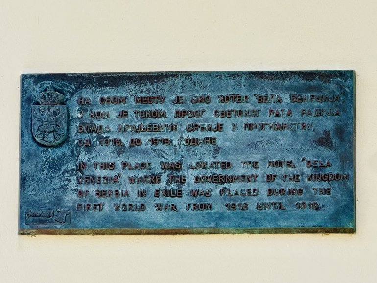 U hotelu "Bela Venecija", nedaleko od sadašnje Srpske kuće, zasedala je Vlada. Hotel je takođe srušen, u blizini je podignut nov istog imena, a na stambenoj zgradi gde se nalazio bivši, takođe je postavljena spomen-ploča. Kasniji predsednik vlade Milan Stojadinović, za čijeg mandata je podignut Mauzolej na Vidu, tu je upoznao svoju buduću suprugu Augustu. Vlasnik hotela sve tri svoje kćeri dao je Srbima. Bilo je na Krfu u ta ratna vremena i ljubavi, ali su se praktično svi do jednog sposobni redovi preko Solnuskog fronta vratili na ognjište. Neki su se, posle, vraćali na Krf. Danas ovde ima pedesetak porodica koje nose naša prezimena.