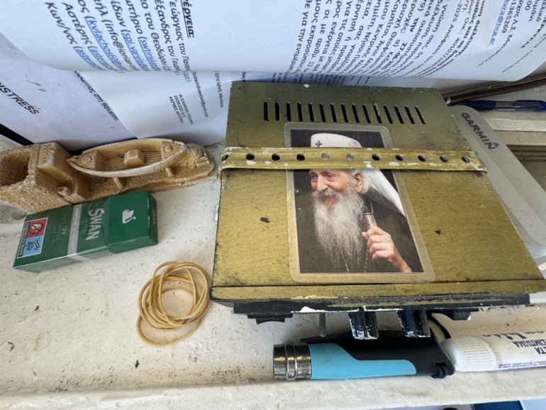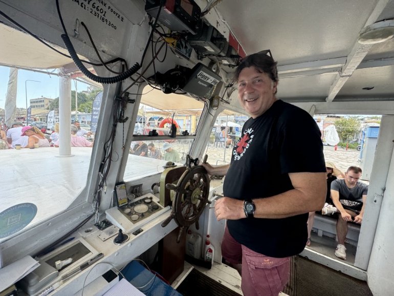 Malenom barkom upravlja kapetan Sotiris. Oduševljen je, kaže, time što među putnicima uvek ima mnogo mladih i dece koja čuvaju sećanja i uspomene s kolena na koleno. Preko prijemnika radio-stanice u kabini zalepio je veliku fotografiju počivšeg srpskog patrijarha Pavla.