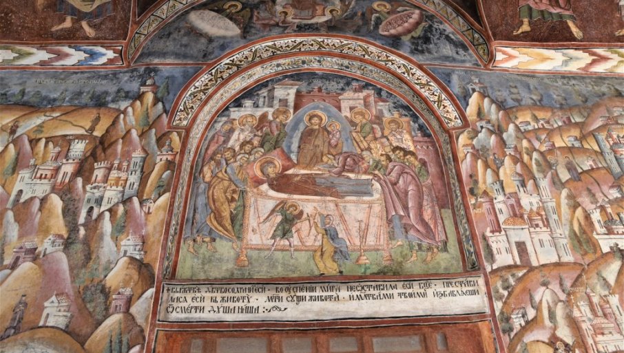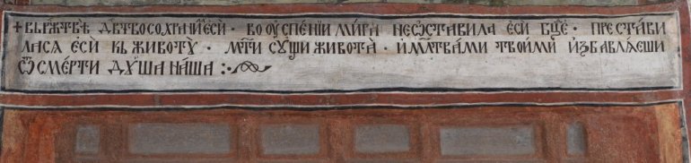 Levi i desni "list" te karte razdvaja živopis Uspenja Bogorodice pod kojim je ćirilični natpis na srpskom: "U svom prvom rođenju sačuvala si devičanstvo, u svom obožavanom zaručniku nisi napustila svet, Majko Božja, ti si se preselila u život, budući da si majka života, i svojim molitvama izbavljaš od smrti duše naše".