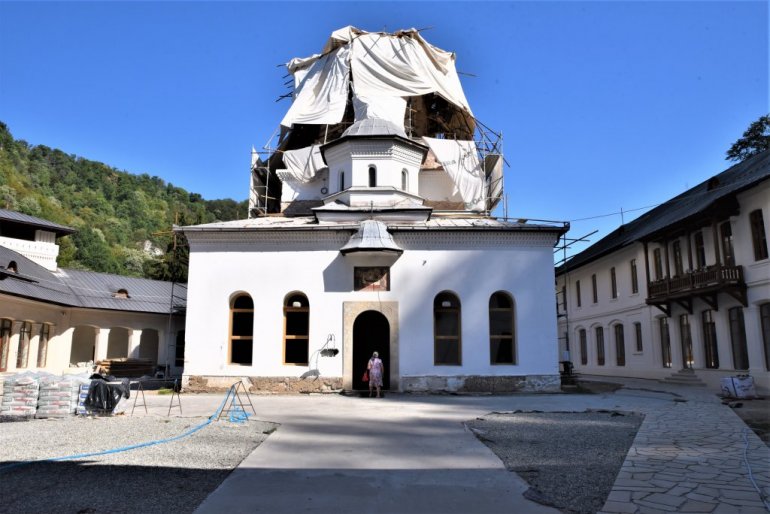 Skele i građevinski materijal na kapiji ulaznog hodnika kroz najvišu manastirsku kulu nagoveštavale su da je u toku neka obnova. Umesto tri kupole njen hrama sada pokriva šator od cirada razapetih preko skela. Kada ih vetar pomeri ukazuje se originalni srednjovekovni izgled građevine od opeke, koja je značajno oštećena skidanjem Šlaterovog maltera.