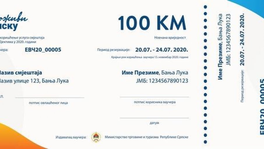 Kako je saopšteno iz Ministarstva trgovine i turizma RS u periodu od 15. juna 2020. godine do 30. juna 2021. godine, građanima u Srpskoj izdato je 46.948 turističkih vaučera vrednosti od po 100 KM, za smeštaj u ugostiteljskim objektima koji posluju na području Srpske.
