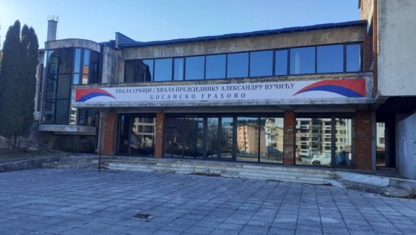 LOKALNA vlast u Bosanskom Grahovu postavila je veliki plakat na delimično rekonstruisani Dom kulture "Gavrilo Princip" u centru tog, još uvek razrušenog gradića u Bosanskoj krajini, u znak zahvalnosti za sredstva koja su Republika Srbija i predsednik Srbije Aleksandar Vučić donirali za rekonstrukciju krova i vanjske stolarije ove zgrade.