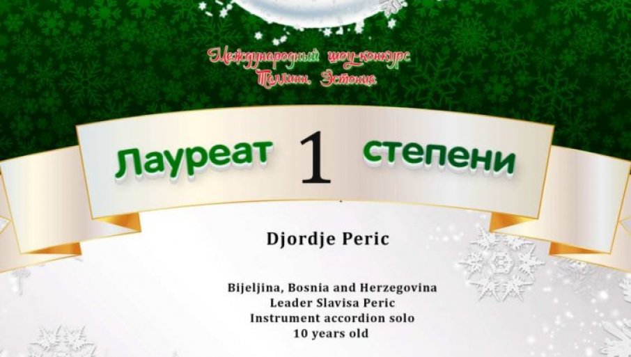 DESETOGODIŠNjI Đorđe Perić iz Bijeljine osvojio je zlatnu medalju na Internacionalnom muzičkom festivalu "Vinter reveal fest" održanom od 03-07. marta 2021 u onlajn format u gradu Talin u Estoniji.