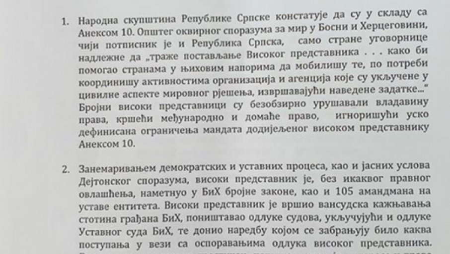 - Krajnje je vreme da OHR bude zatvoren, a odgovornost za budućnost i funkcionisanje BiH postane isključivo pravo i nadležnost naroda u BiH. NS RS smatra da BiH mora sama da preuzme odgovornost za svoj razvoj u skladu s Dejtonskim sporazumom i međunarodnim pravom. Ako to ne bude na dnevnom redu u skorije vreme, treba pokrenuti razgovore o mirnom razlazu, u skladu s Poveljom Ujedinjenih nacija - napisano je u zaključcima koji se nalaze pred poslanicima NSRS.