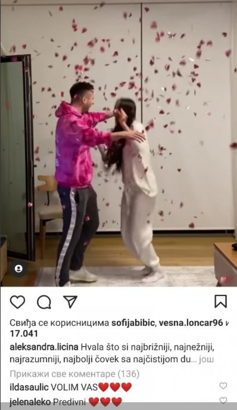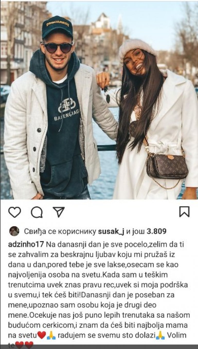 - Na današnji dan je sve počelo, želim da ti se zahvalim za beskrajnu ljubav koju mi pružaš iz dana u dan, pored tebe je sve lakše, osećam se kao najvoljenija osoba na svetu. Kada sam u teškim trenucima, uvek znaš pravu reč, uvek si moja podrška u svemu i tek ćeš biti. Današnji dan je poseban za mene, upoznao sam osobu koja je drugi deo mene. Očekuje nas još puno lepih trenutaka sa našom budućom ćerkicom i znam da ćeš biti najbolja mama na svetu. Radujem se svemu što dolazi. Volim te - napisao je Luka.