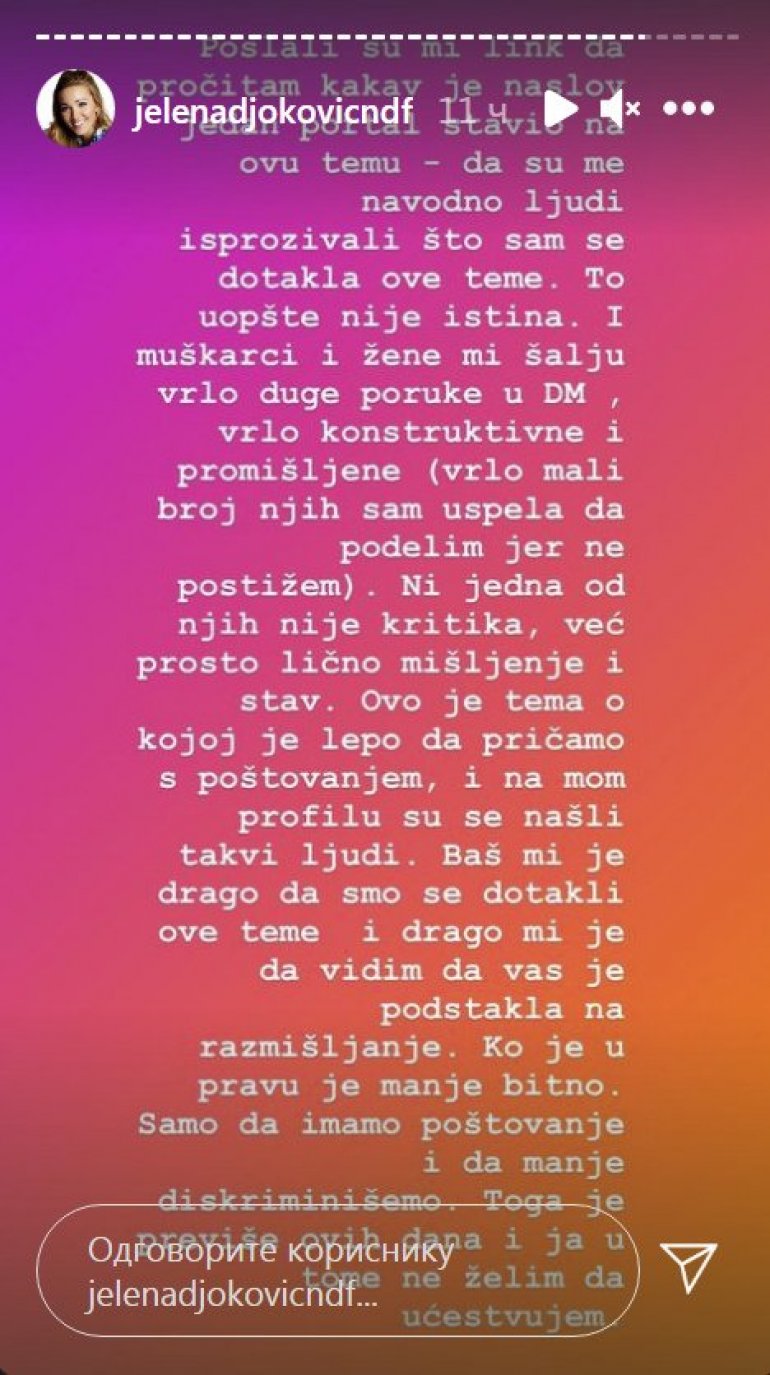 - Poslali su mi link da pročitam kakav je naslov jedan portal stavio na ovu temu - da su me ljudi isprozivali što sam se dotakla ove teme. To uopšte nije istina. I muškarci i žene mi šalju vrlo duge poruke u DM, vrlo konstruktivne i promišljene (vrlo mali broj njih sam uspela da podelim jer ne postižem). Ni jedna od njih nije kritika, već prosto lično mišljenje i stav. Ovo je tema o kojoj je lepo da pišemo s poštovanjem i na mom profilu su se našli takvi ljudi. Baš mi je drago da smo se dotakli ove teme i drago mi je da vidim da vas je podstakla na razmišljanje. Ko je u pravu je manje bitno. Samo da imamo poštovanje i da manje diskriminišemo. Toga je previše ovih dana i ja u tome ne želim da učestvujem - napisala je Jelena na storiju.