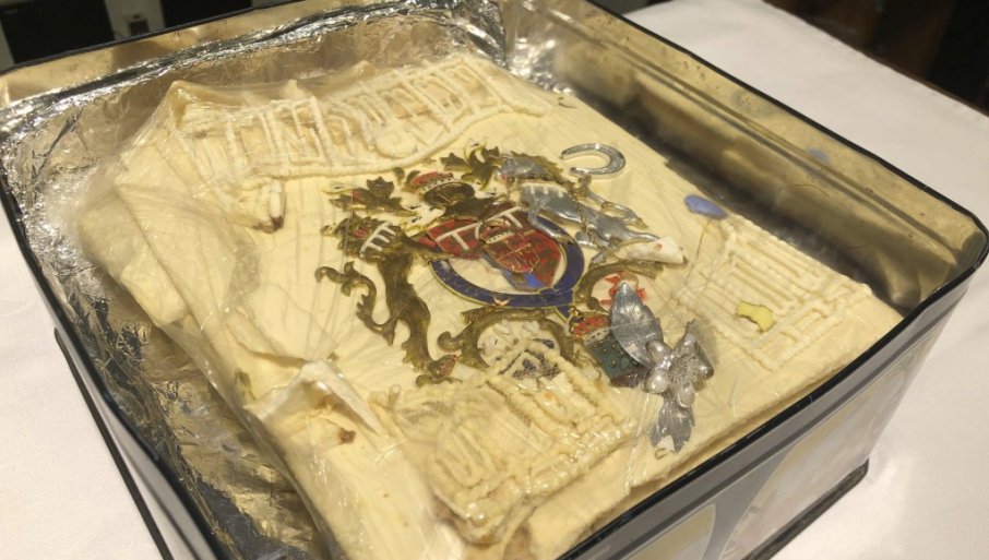 Na velikom parčetu kolača čija je podloga od marcipana prikazan je kraljevski grb u zlatnoj, crvenoj, plavoj i srebrnoj boji, prenosi AP.