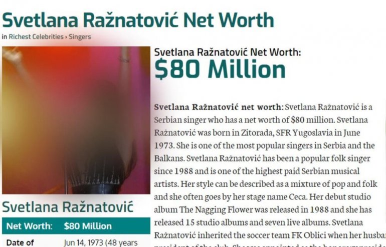 SVETSKI poznati sajt "Celebrity net worth" otkrio je koliko su "teške" brojne poznate face, među kojima su se našla i Svetlana Ceca Ražnatović.