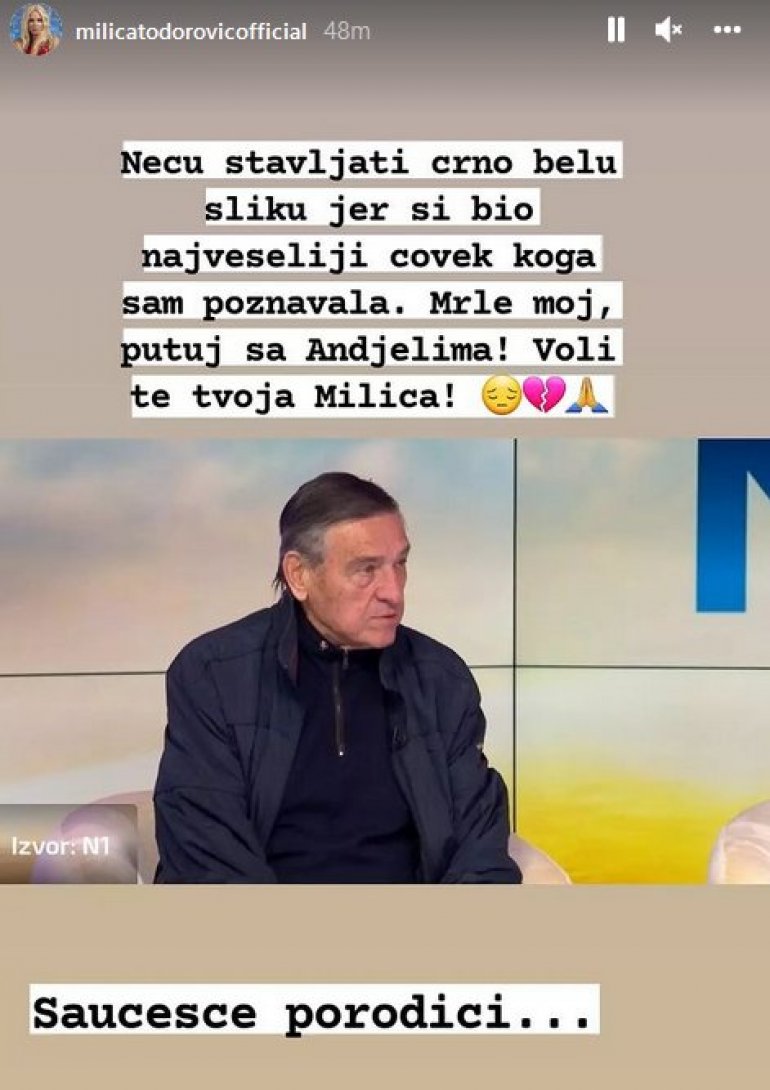 - Neću stavljati crno-belu sliku, jer si bio najveseliji čovek koga sam poznavala. Mrle moj, putuj sa anđelima, bio si pun ljubavi. Voli te tvoja Milica - napisala je pevačica na Instagramu.