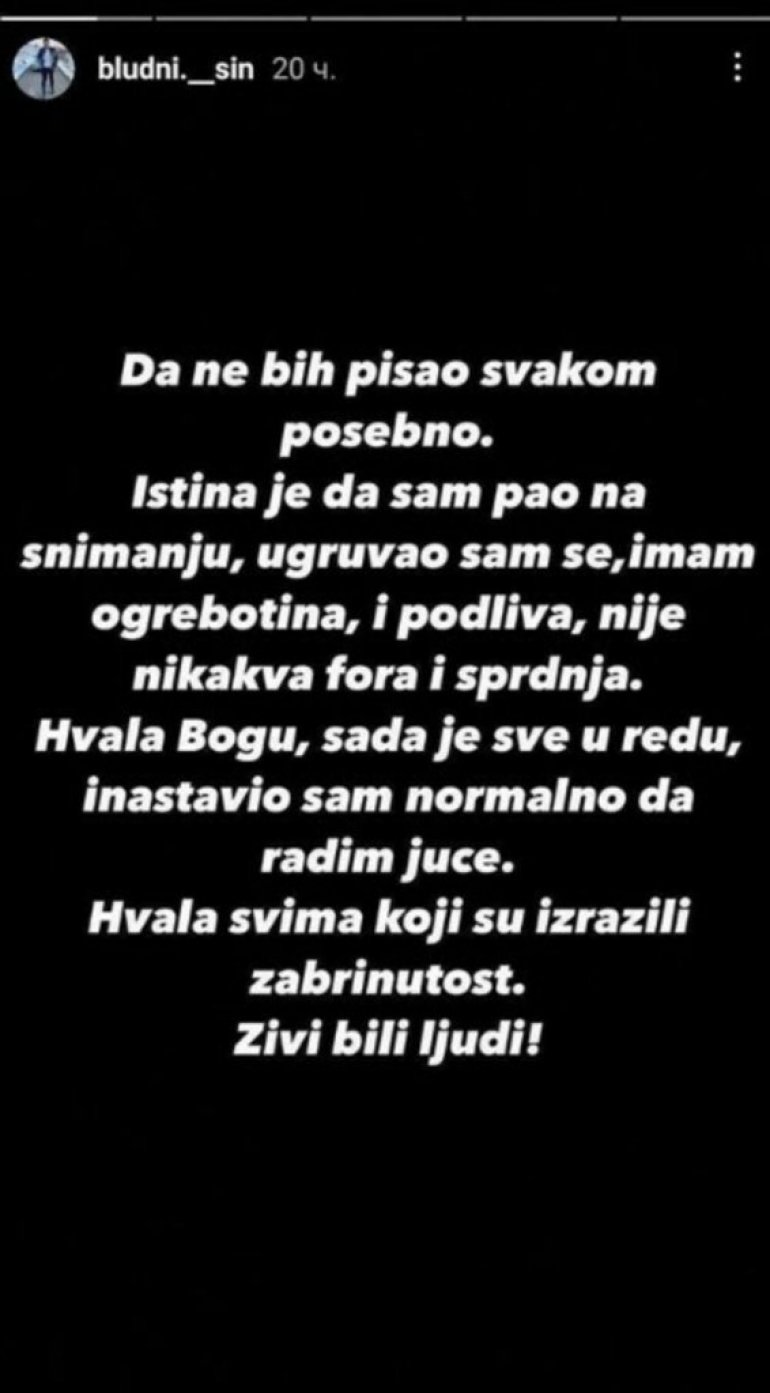 - Da ne bih pisao svakom posebno... Istina je da sam pao na snimanju, ugruvao sam se, imam ogrebotina i podliva, nije nikakva fora i sprdnja. Hvala Bogu, sada je sve u redu, i nastavio sam normalno da radim juče. Hvala svima koji su izrazili zabrinutost. Živi bili, ljudi! - poručio je Babić.