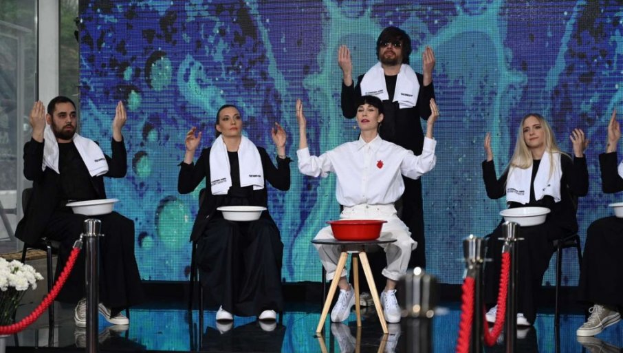 Nakon izvođenja pesme, Konstrakta je prisutnima podelila peškire i ruže.