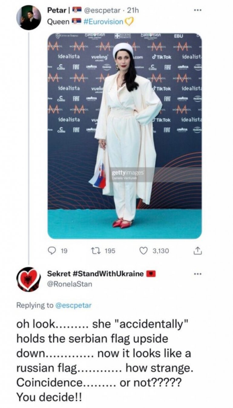 - Oh, gledajte, ona “slučajno” drži srpsku zastavu naopačke. Sada izgleda kao ruska zastava, kako čudno. Slučajnost, ili ne? Vi odlučite… – napisao je koristik Tvitera u opisu slike.