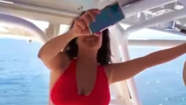 U crvenom bikiniju, sa sunčanim naočarima, Hajekova pleše sa šeširom u ruci uz pesmu "Srećan rođendan".