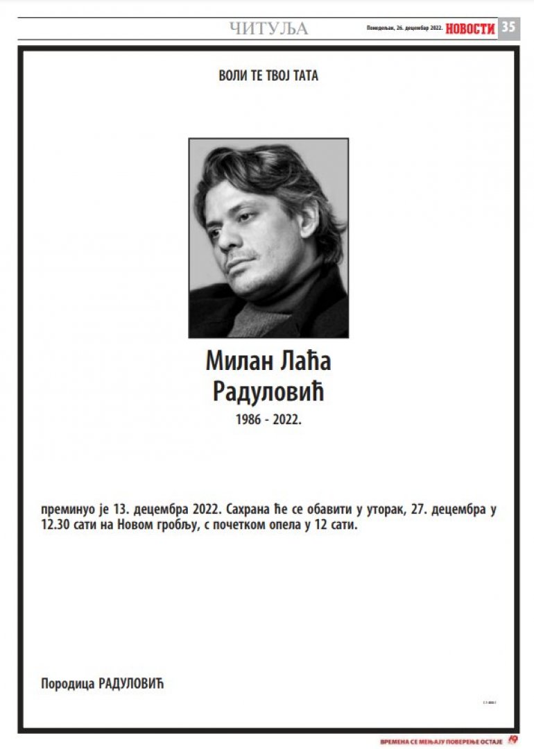 SAHRANA Milana Laće Radulovića zakazana je za utorak 27. decembar od 12:30, a otac Aleksandar Futa Radulović je posvetio čitulju svom sinu preko cele strane "Večernjih novosti".