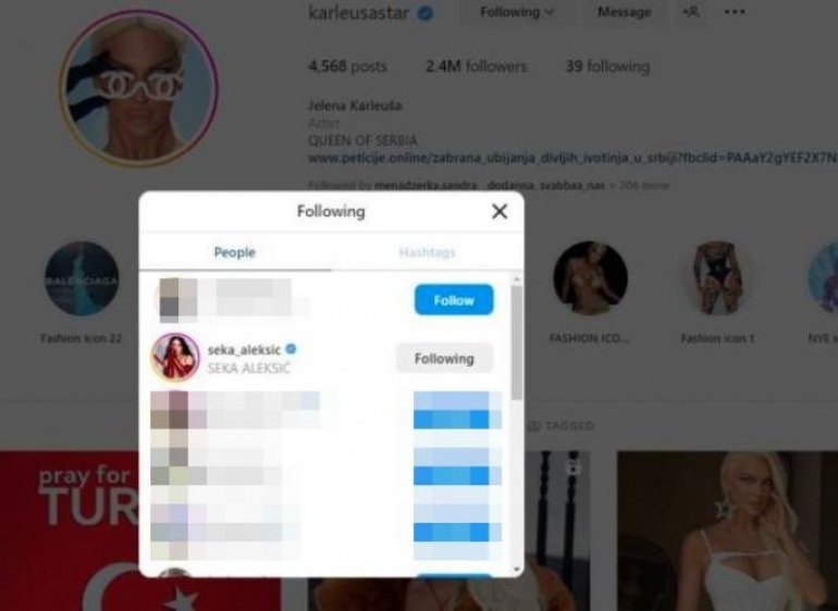 Karleuša koju na popularnoj mreži prati 2,4 miliona ljudi prati svega 39 osoba među kojima je i koleginica Seka, koja je takođe jedna od najpraćenijih ljudi sa naših prostora sa brojem pratilaca koji prelazi cifru od 2 miliona.