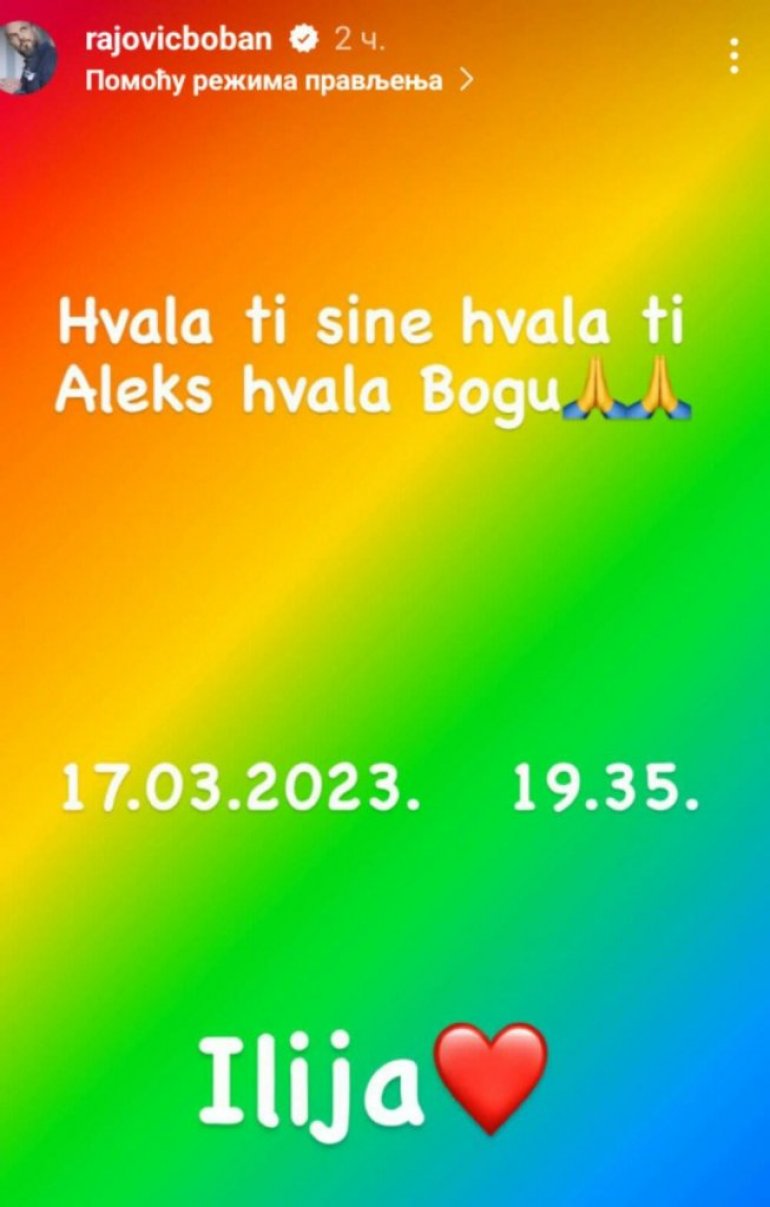 - Hvala ti sine, hvala ti Aleks hvala Bogu. 17.3.2023. u 19:35 Ilija - napisao je Boban na Instagramu.