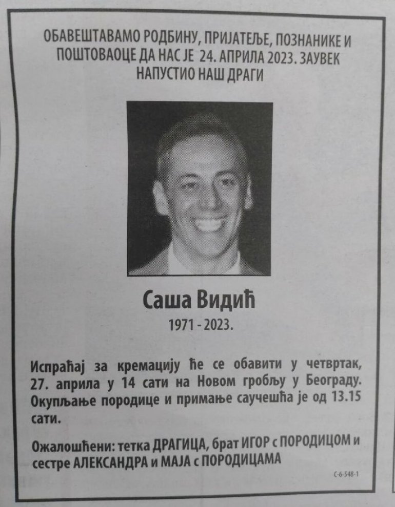 - Obaveštavamo rodbinu, prijatelje, poznanike i poštovaoce da nas je 24. aprila zauvek napustio naš dragi Saša Vidić.