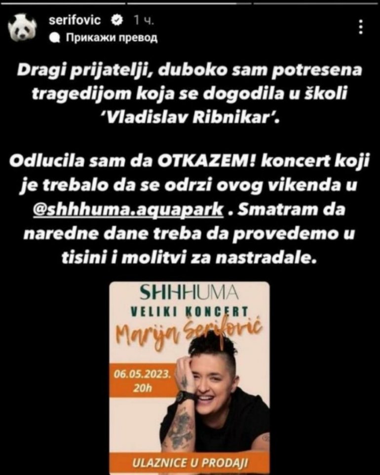 - Dragi prijatelji, duboko sam potresena tragedijom koja se dogodila u školi "Vladislav Ribnikar". Odlučila sam da otkažem koncert koji je trebalo da se održi ovog vikenda u akvaparku u Hrvatskoj. Smatram da naredne dane treba da provedemo u tišini i molitvi za nastradale. Moje najiskrenije saučešće i solidarnost u bolu za porodice poginule dece i radnika škole. Marija - napisala je pevačica.