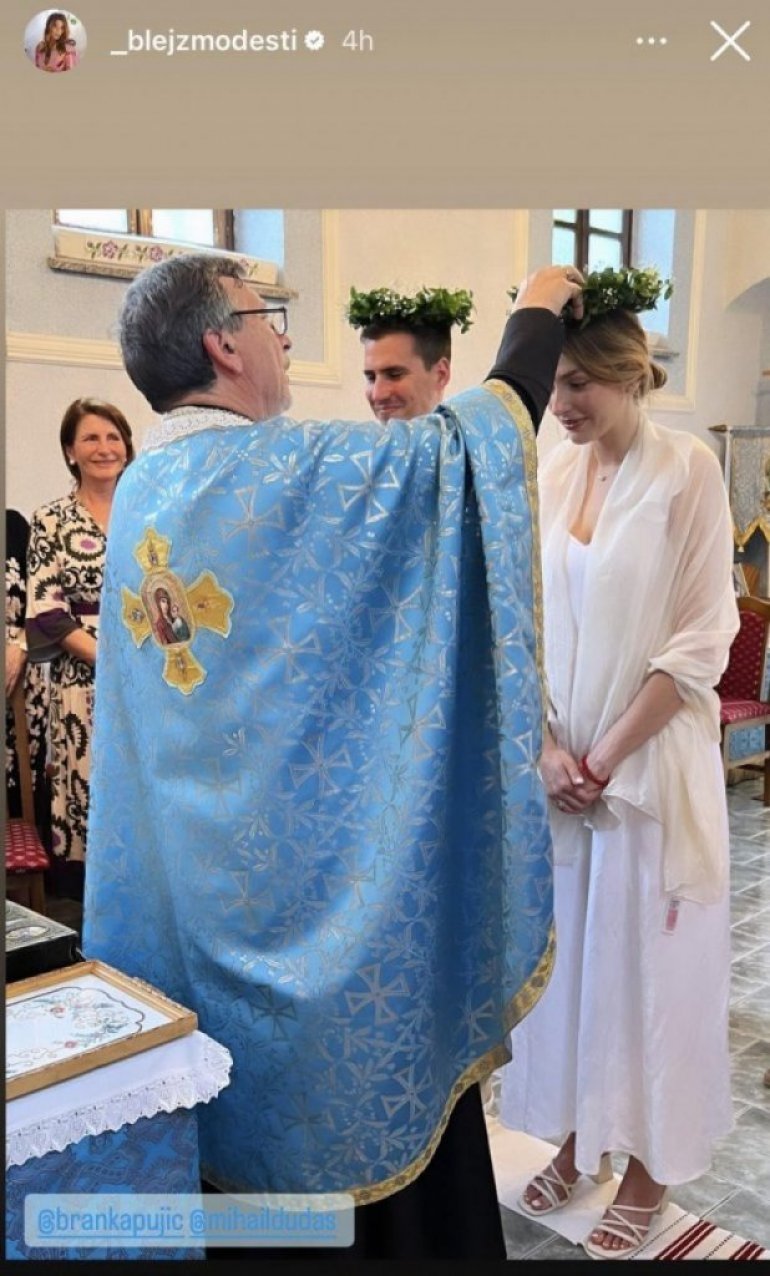 Mlada je blistala u beloj, dugoj korset venčanici sa dubokim šlicem, dugim velom i velikim bidermajerom od raznobojnog cveća, dok je mladoženja nosio tamno odelo i belu košulju, dok je posebno zanimljiv bio detalj koji je nosio na glavi u vidu venca.