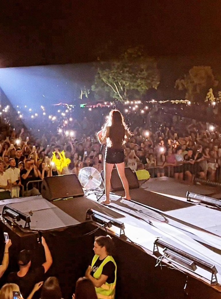 Pevačica se na bini pojavila u kratkoj svetlucavoj haljini koja je savršeno istakla njenu vitku figuru, i time izazvala opšte oduševljenje svih.