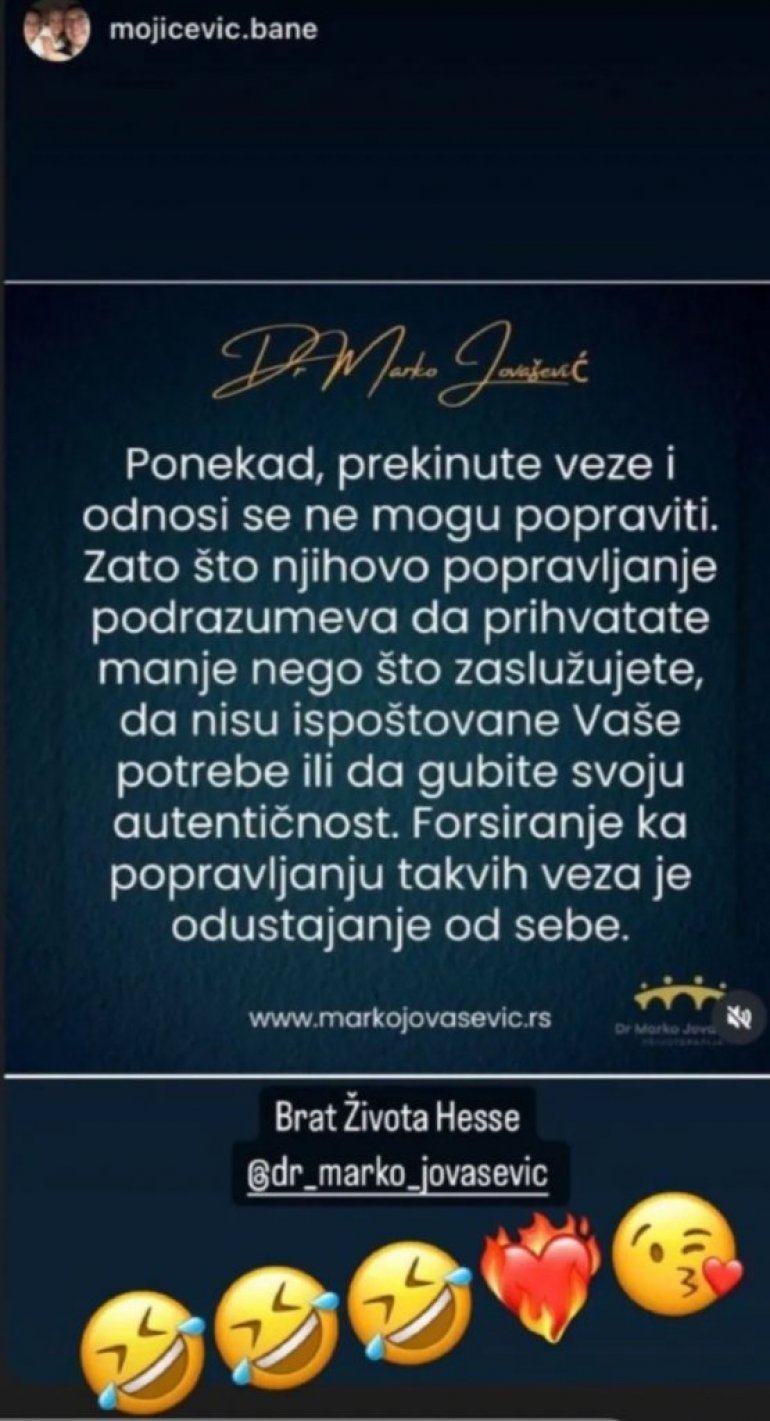 - Ponekad prekinute veze i donosi se ne mogu popraviti. Zato što popravljanje podrazumeva da prihvatate manje nešto zaslužujete, da nisu ispoštovane vaše potrebe ili da gubite svoju autentičnost. Forsiranje ka popravljanju takvih veza je odustajanje od sebe – citirao je Bane doktora Marka Jovaševića na Instagramu.