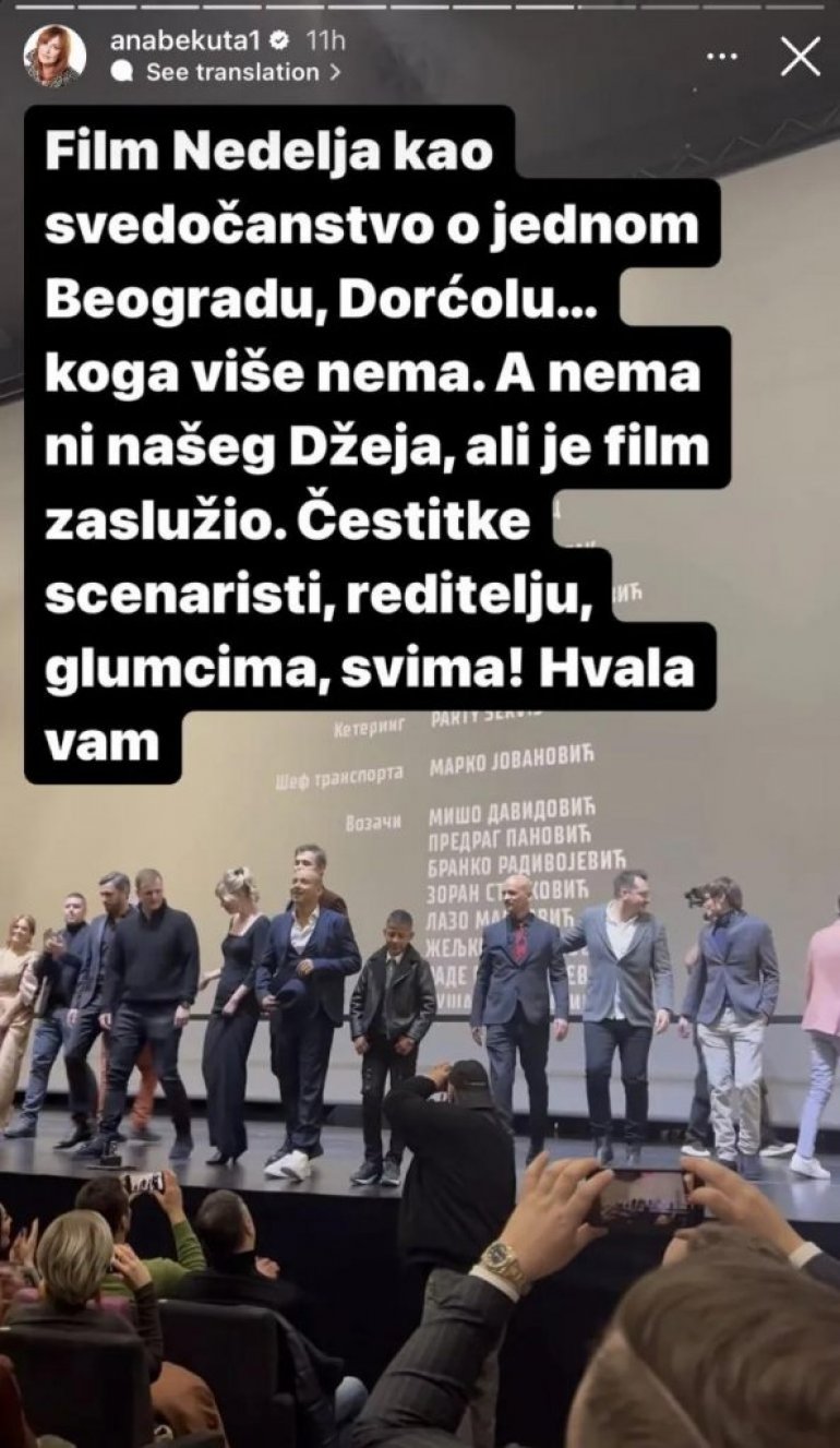 -Film „Nedelja“ kao svedočanstvo o jednom Beogradu, Dorćolu koga više nema. A nema ni našeg Džeja, ali je film zaslužio čestitke scenaristi, reditelju, glumcima, svima! Hvala vam – napisala je Bekuta.
