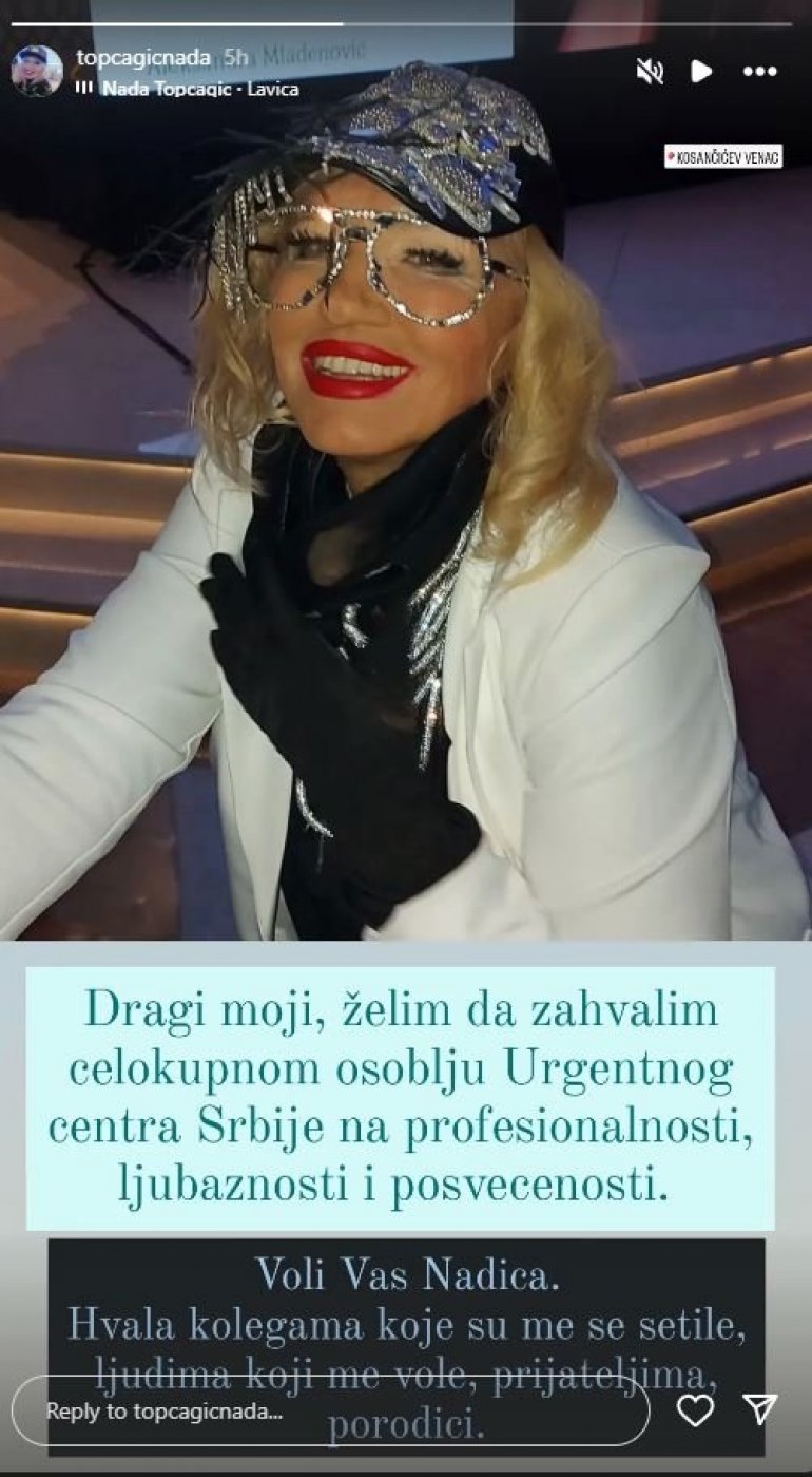 - Dragi moji, želim da se zahvalim celokupnom osoblju Urgentnog centra Srbije na profesionalnosti, ljubaznosti i posvećenosti - napisala je Nada Topčagić i dodala:
