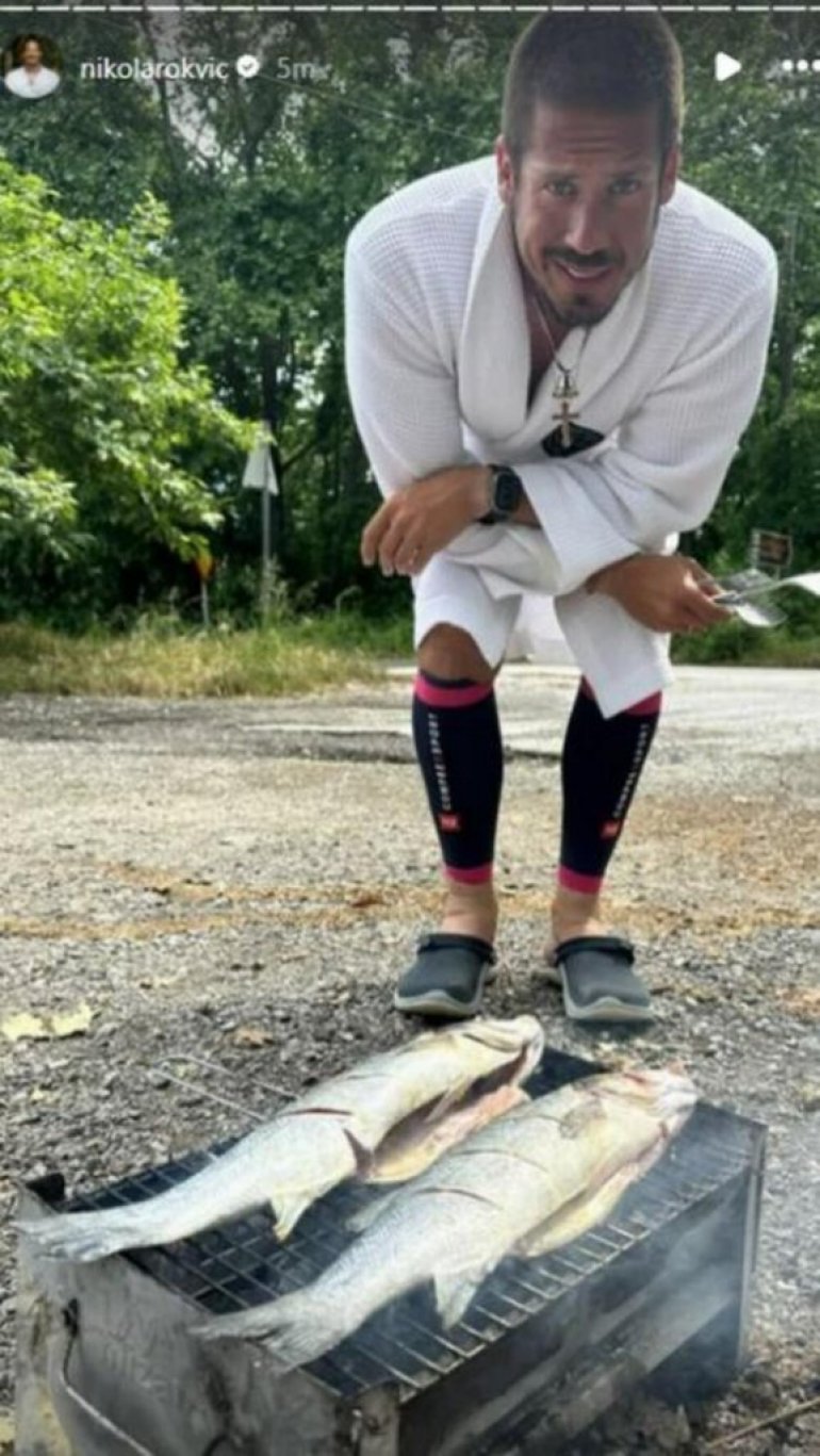 Nikola je pozirao u bademantilu i papučama sa viljuškom u ruci dok se ispred njega nalazio roštilj na kojem se nalazila riba.