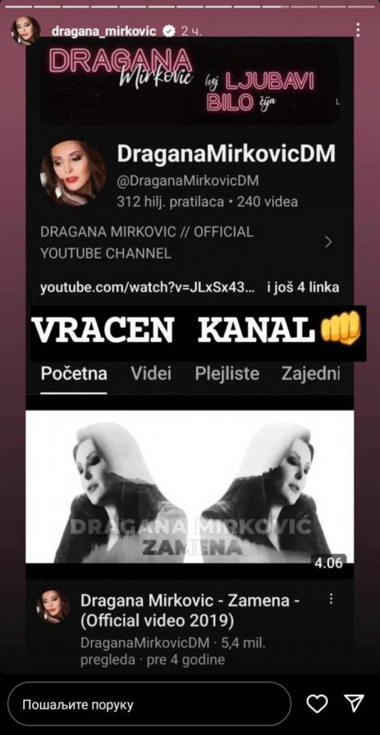 Da podsetimo da je ovaj kanal imao više od 300.000 pretplatnika i gotovo pola milijarde pregleda u trenutku kada je kanal oboren, ali sada ponovo fanovi Dragane Mirković njene spotove mogu da nađu na jednom kanalu. Inače, na ovom kanalu sada ima 240 klipova, spotova i snimaka.