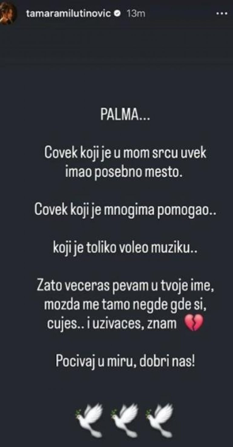 Poznata pevačica Tamara Milutinović godinama je poznavala Palmu i imala je priliku da mu peva, a koliko poštovanja je imala prema njemu pokazala je i u oproštajnoj poruci koju je objavila na Instagramu.
