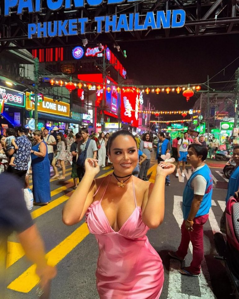 Budući da je dobila preplanuli ten i osim vrelih plaža, "žena od sultana" osetila je i čari noćnog provoda na Tajlandu, pa je usred grada pozirala u izazovnoj ciklama haljini koja je pratila liniju njenog tela.