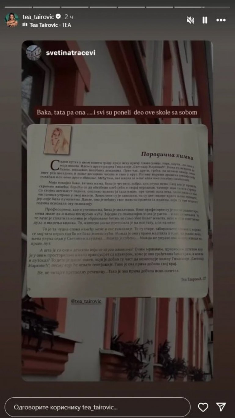 JEDNA od najpopularnijih muzičkih zvezda mlađe generacije Tea Tairović podelila je emotivni isečak iz monografije Gimnazije "Svetozar Marković", škole koju je pohađala.