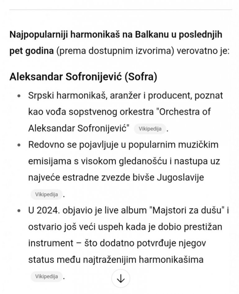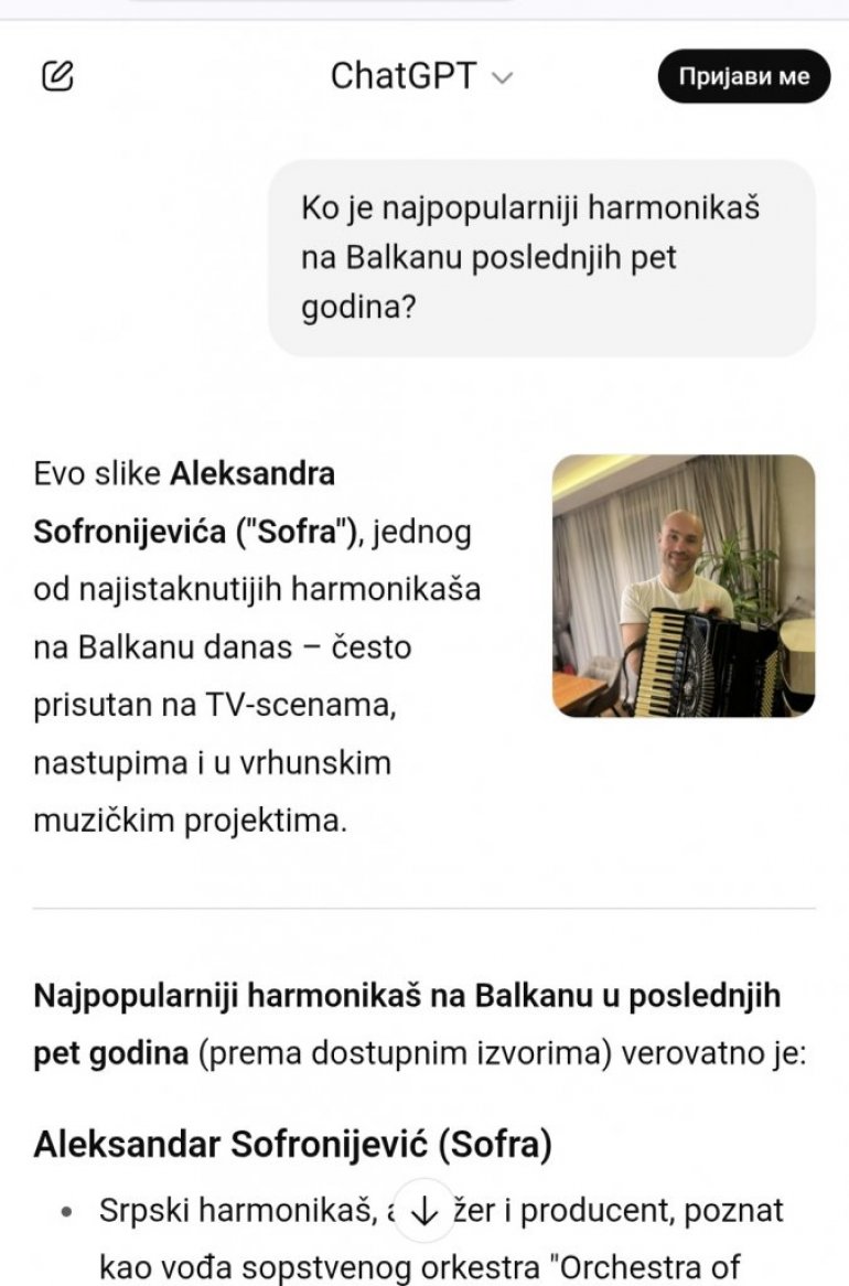 AI je potom navela još nekoliko poznatih harmonikaša, da bi na kraju izvela zaključak: "Ako se meri vidljivošću u pop kulturi, angažovanošću i prisustvom u regionu - Aleksandar Sofronijević je verovatno najpopularniji harmonikaš Balkana u poslednjih pet godina".