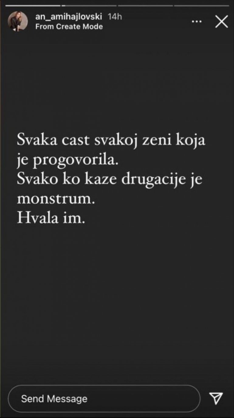 - Svaka čast svakoj ženi koja je progovorila. Svako ko kaže drugačije je monstrum. Hvala im - napisala je Ana Mihajlovski na Instagramu.