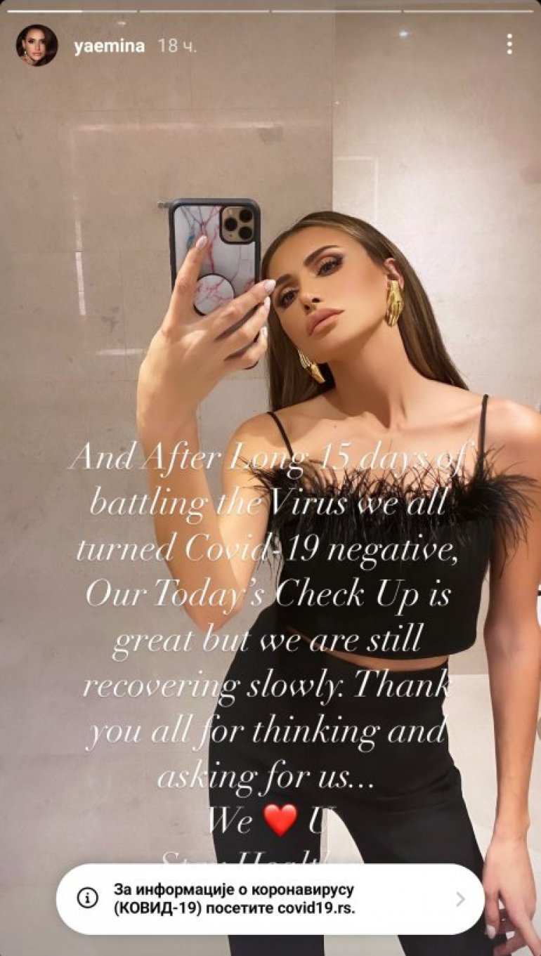 Emina je sa pratiocima podelila da su dobili negativan rezultat, te navela da im sada sledi oporavak.